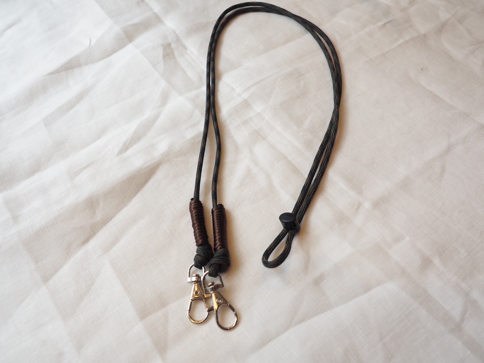 パラコード(7芯4mm)と光沢のあるサテンコードを使用したのカラフルなショルダーストラップ。